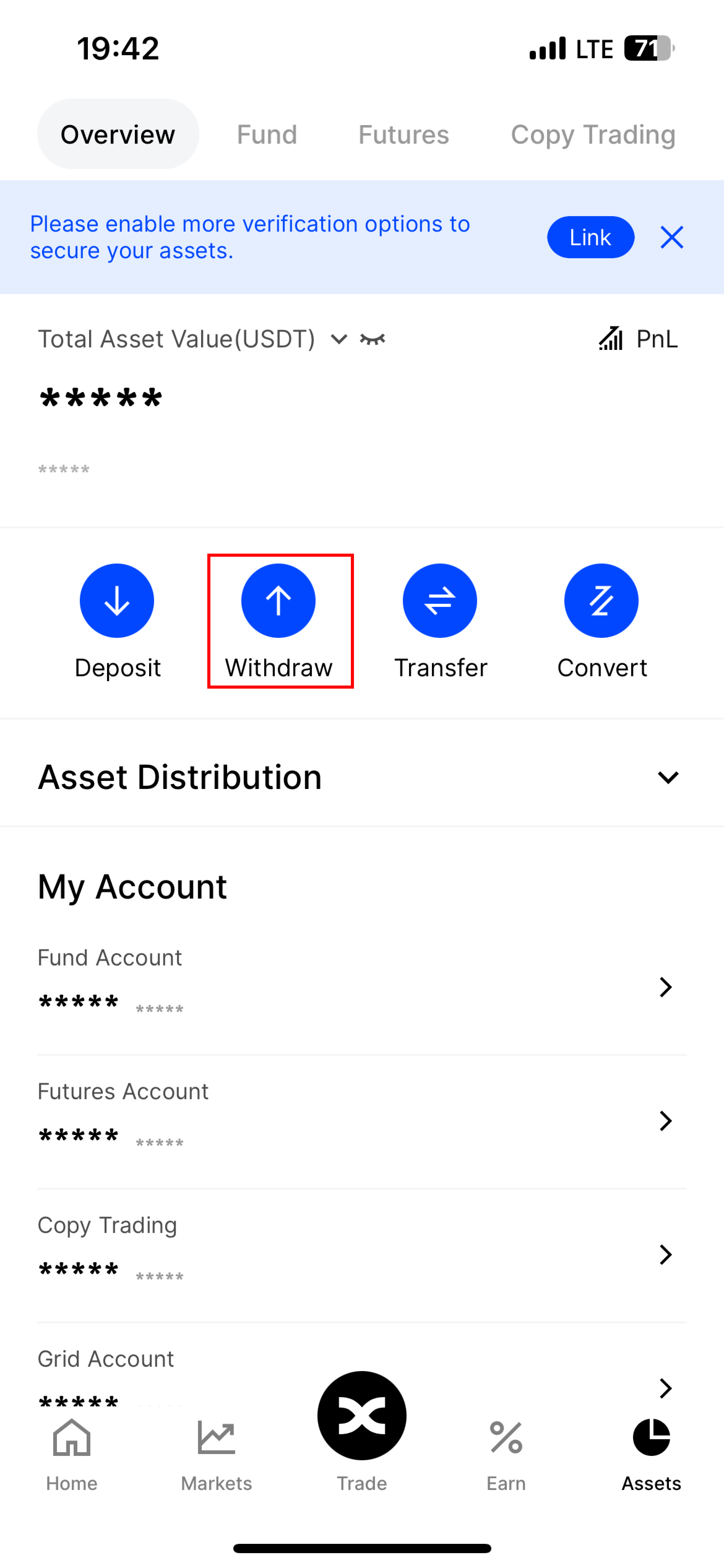 2. Next, open the BingX exchange app and go to the **“Assets”** section. In this section, click on **“Withdraw”.**
