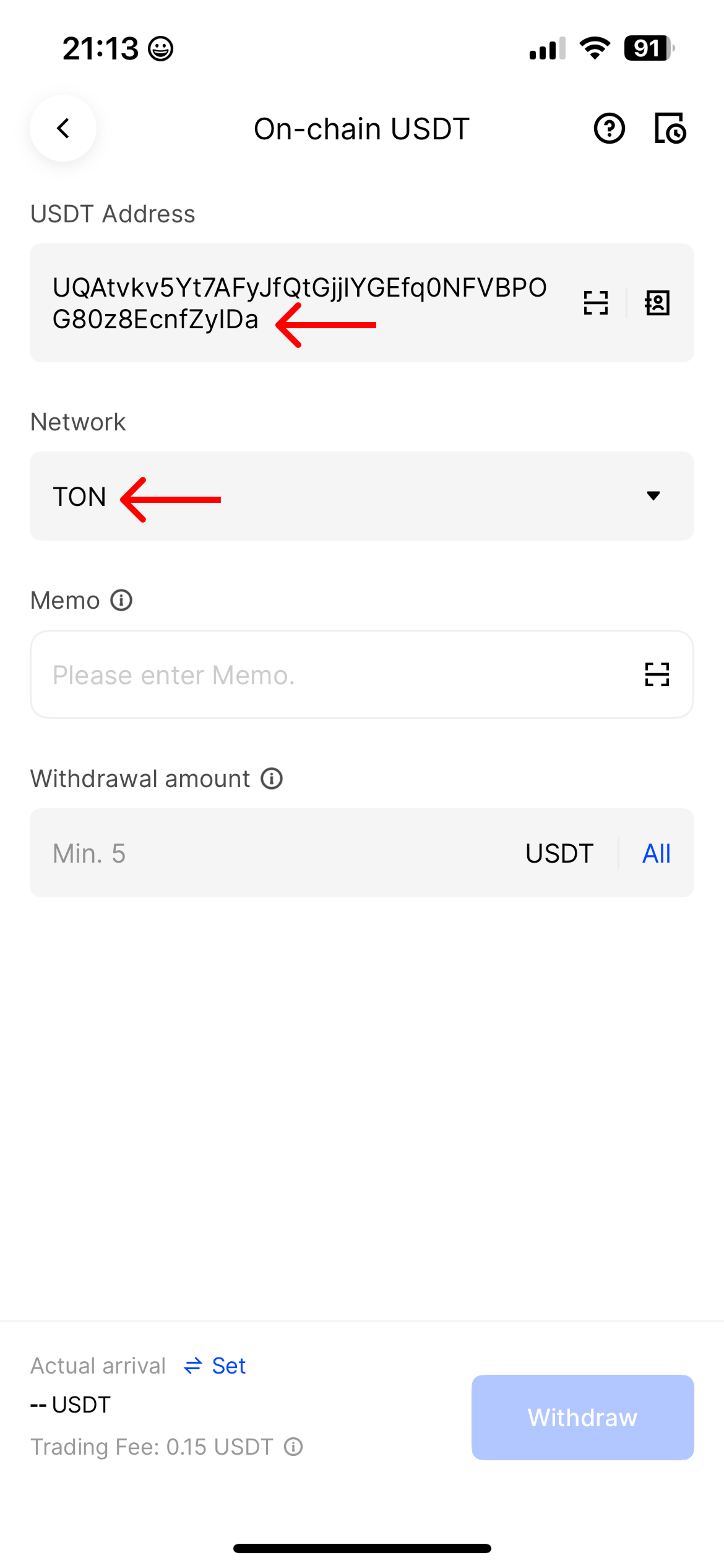 6. In the “USDT Address” field, paste the copied address from the HASH7 app. <mark style="color:purple;">**The TON network should be pulled up automatically after inserting the wallet address.**</mark>