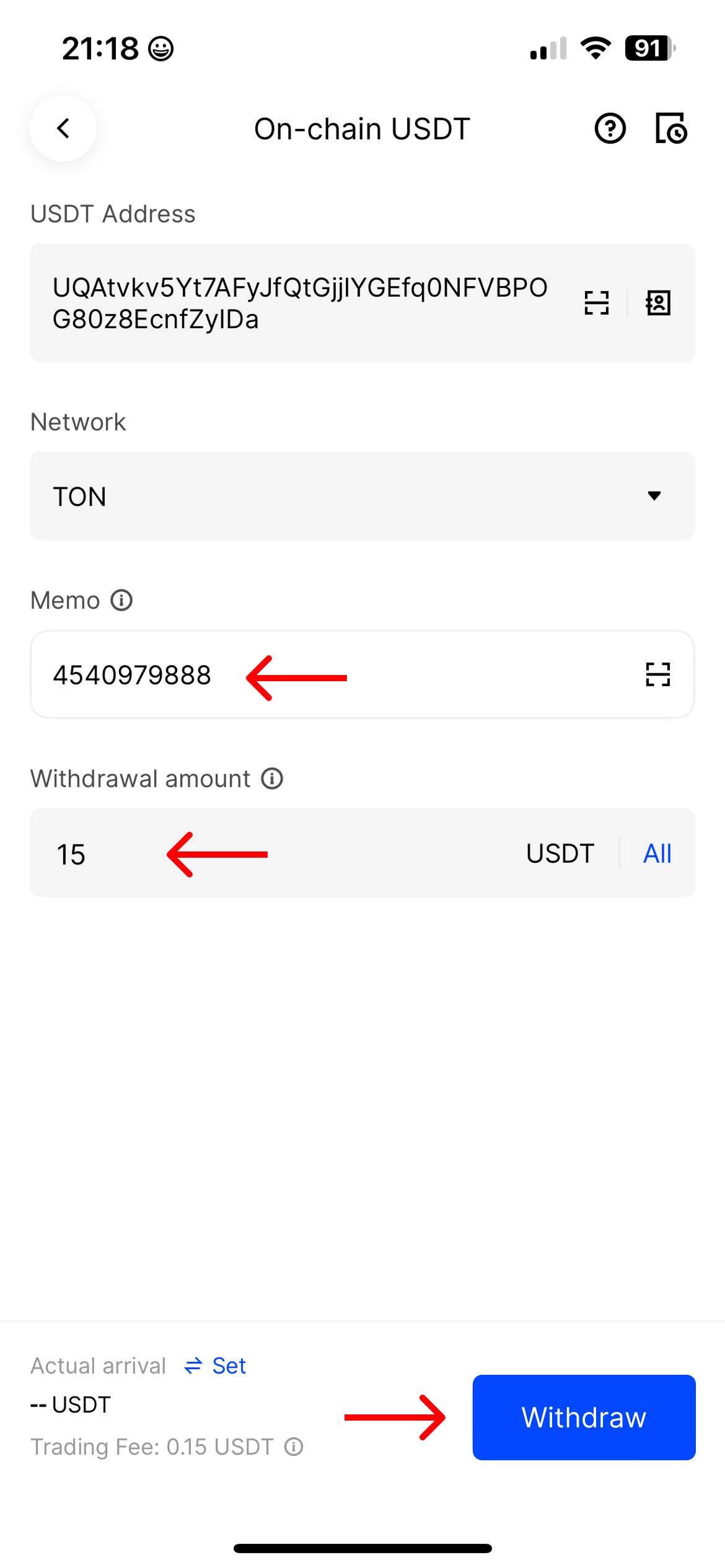 7. Open the BingX app and paste the copied MEMO from the HASH7 app into the *"Memo"* field.\