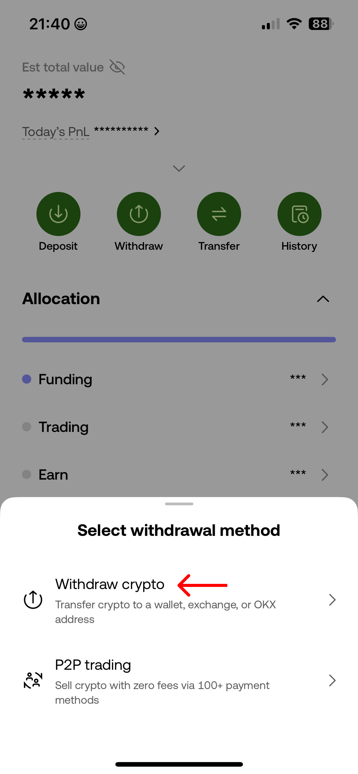 2. Next, open the OKX exchange app and go to the **“Assets”** section. In this section, click on **“Withdraw”.**