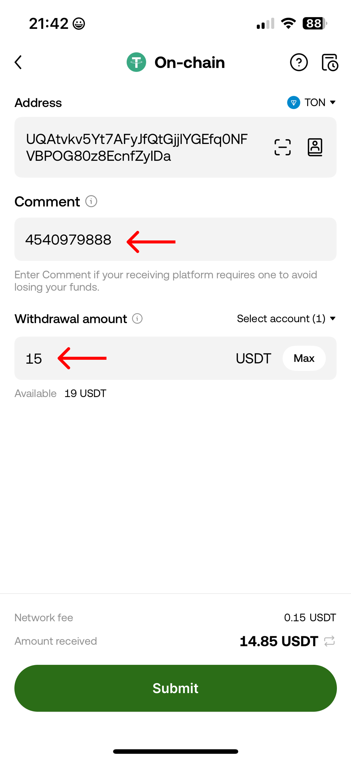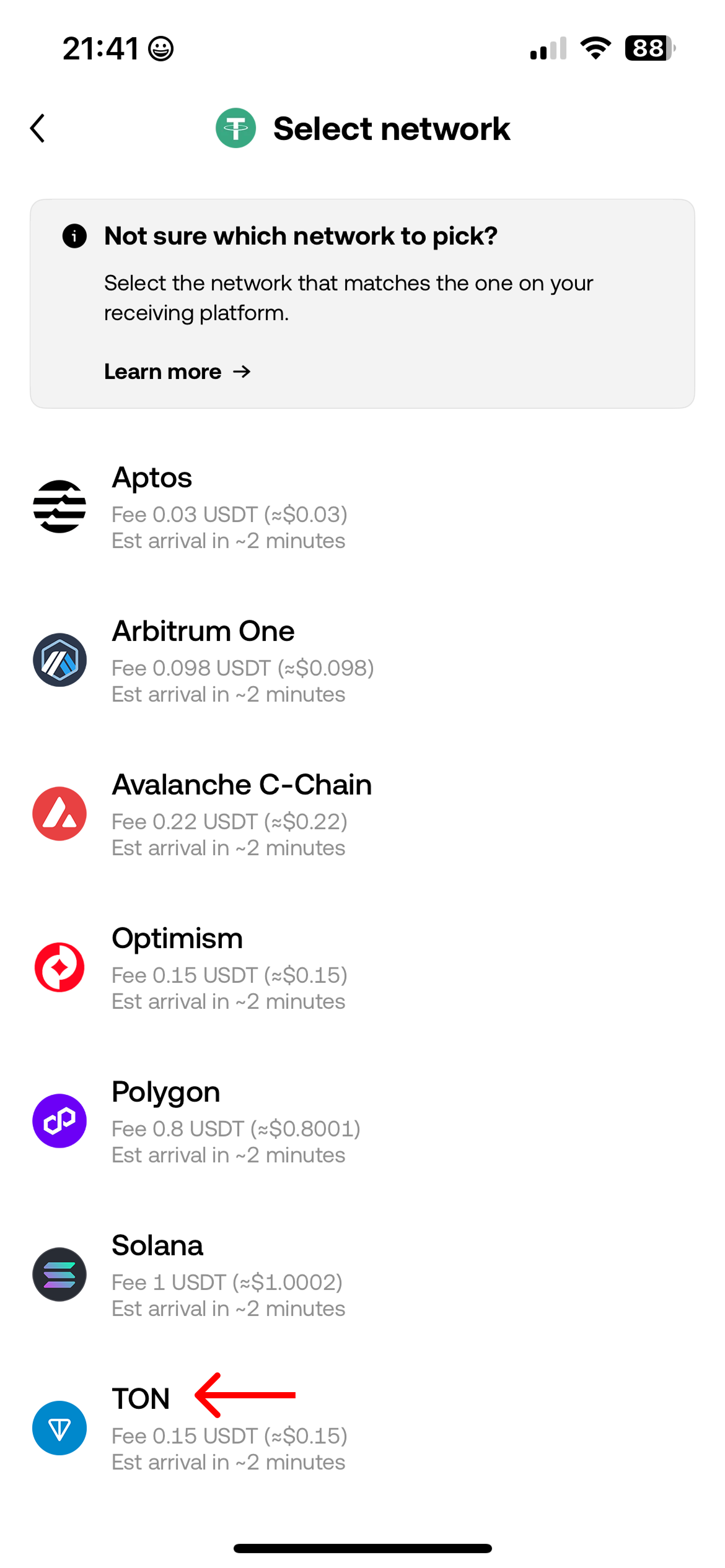 <mark style="color:red;">**Pay special attention to the network, since if the transfer is not made through the TON network, this will lead to an irrevocable loss of the asset.**</mark>