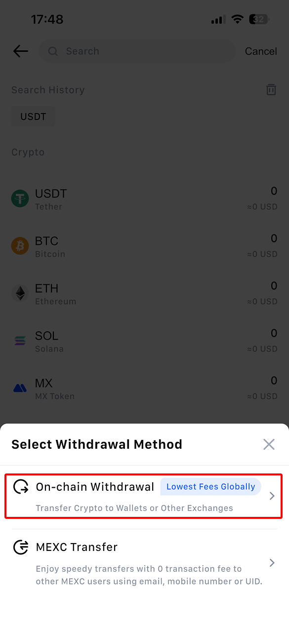 2. Next, open the MEXC exchange app and go to the **“Wallets”** section. In this section, click on **“Withdraw”.**