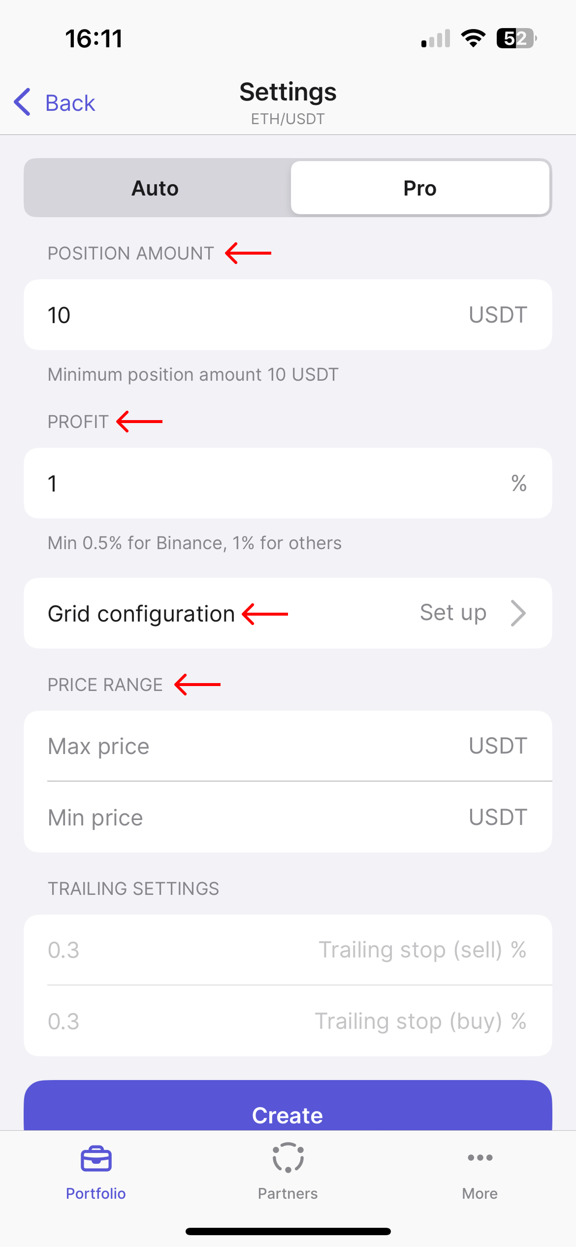 * To complete setting up the strategy in "Pro" mode, tap the "Create" button.