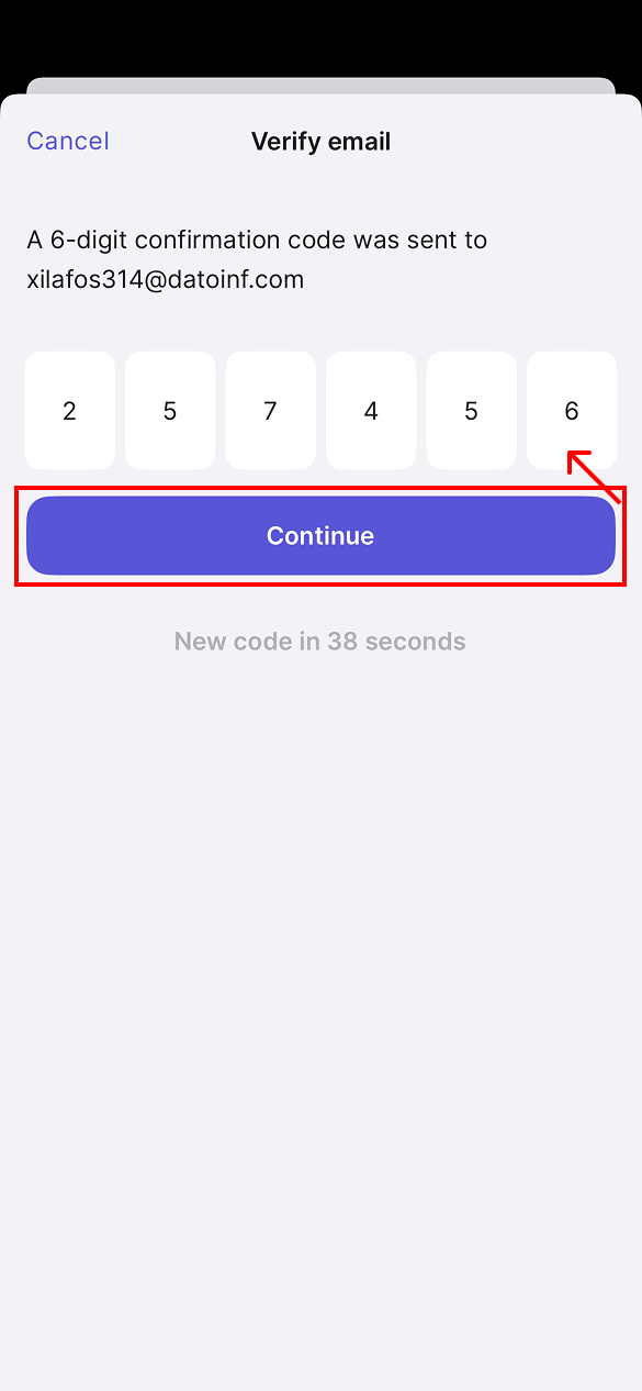 After that, a six-digit code will be sent to the email address you provided. Enter it in the field below and click "Continue."