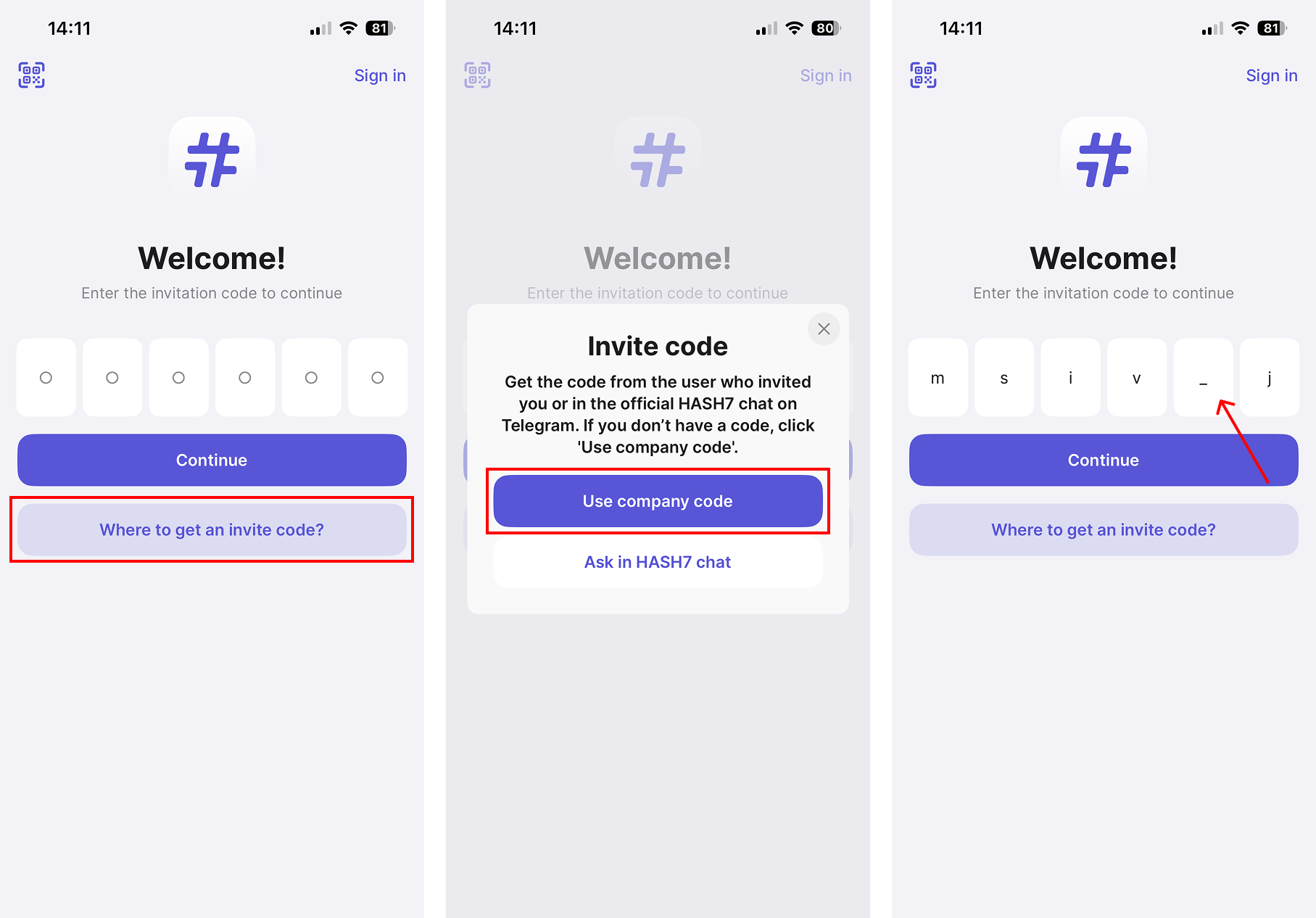 On the registration screen, click on "Where can I get an invitation code?" and then "Use a company code." After that, the company code will be automatically filled in the field, then click on "Continue."
