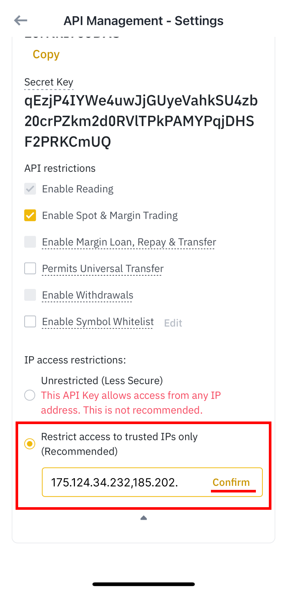 After you've entered the IP-addresses, scroll up and copy your API Key and API Secret and press ''Save''.&#x20;
