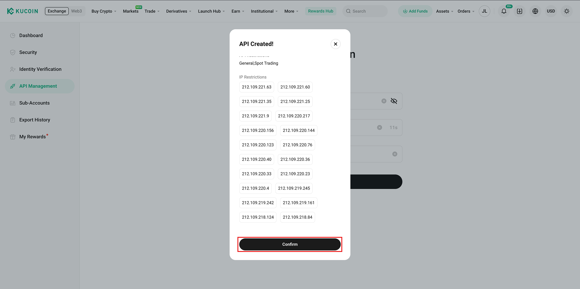Select the KuCoin exchange and copy the IP-addresses.&#x20;