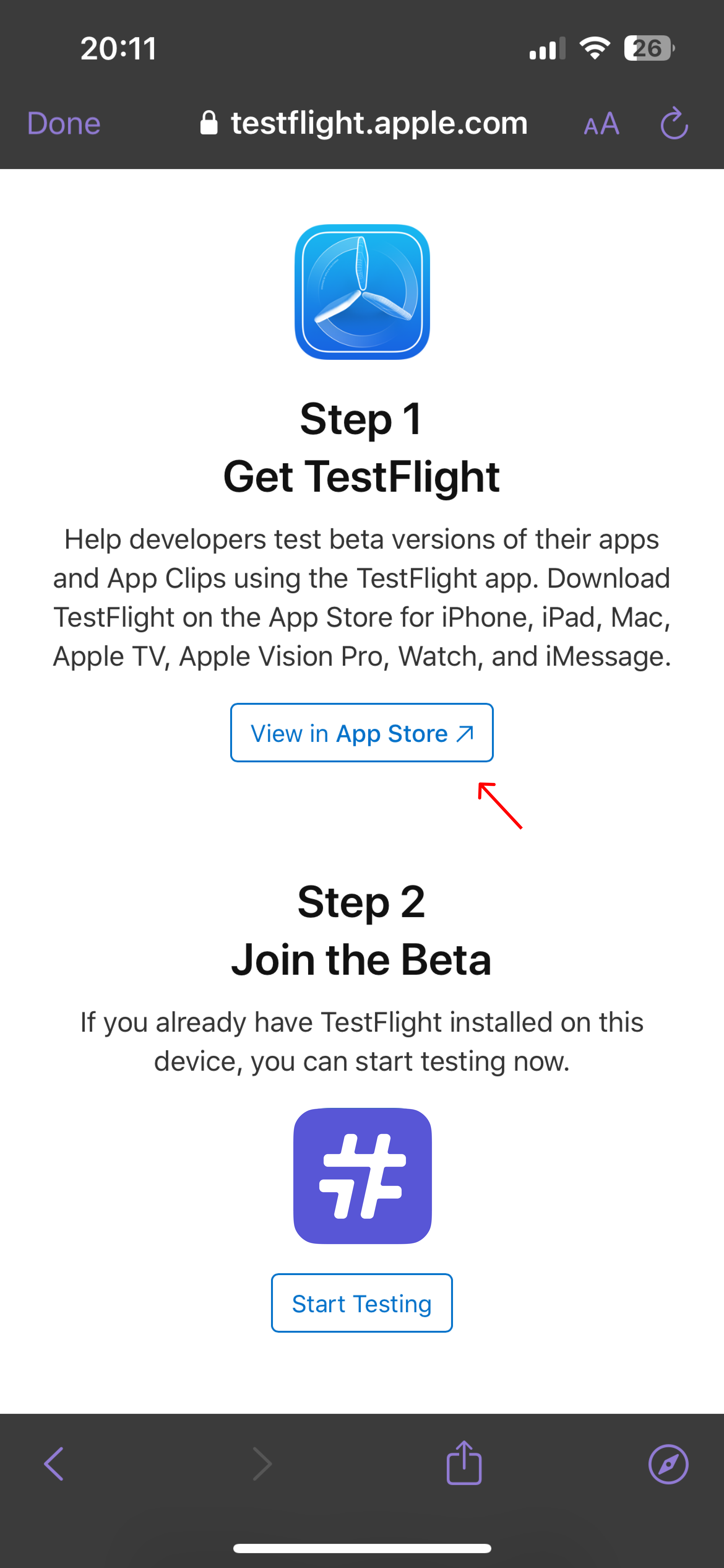 Once the TestFlight app is downloaded to your device you need to re-open the link <https://testflight.apple.com/join/yZg3crZM> and proceed to Step 2 by pressing on the "Start Testing" button.