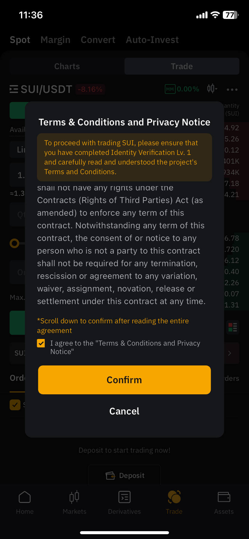 **Binance:** To trade volatile coins through the Binance exchange, you need to find the desired asset on the exchange and, when entering to the asset page, you need to pass a small test and agree to the Terms of Use. Only then you will be able to trade volatile assets through the Hash7 trading bot.