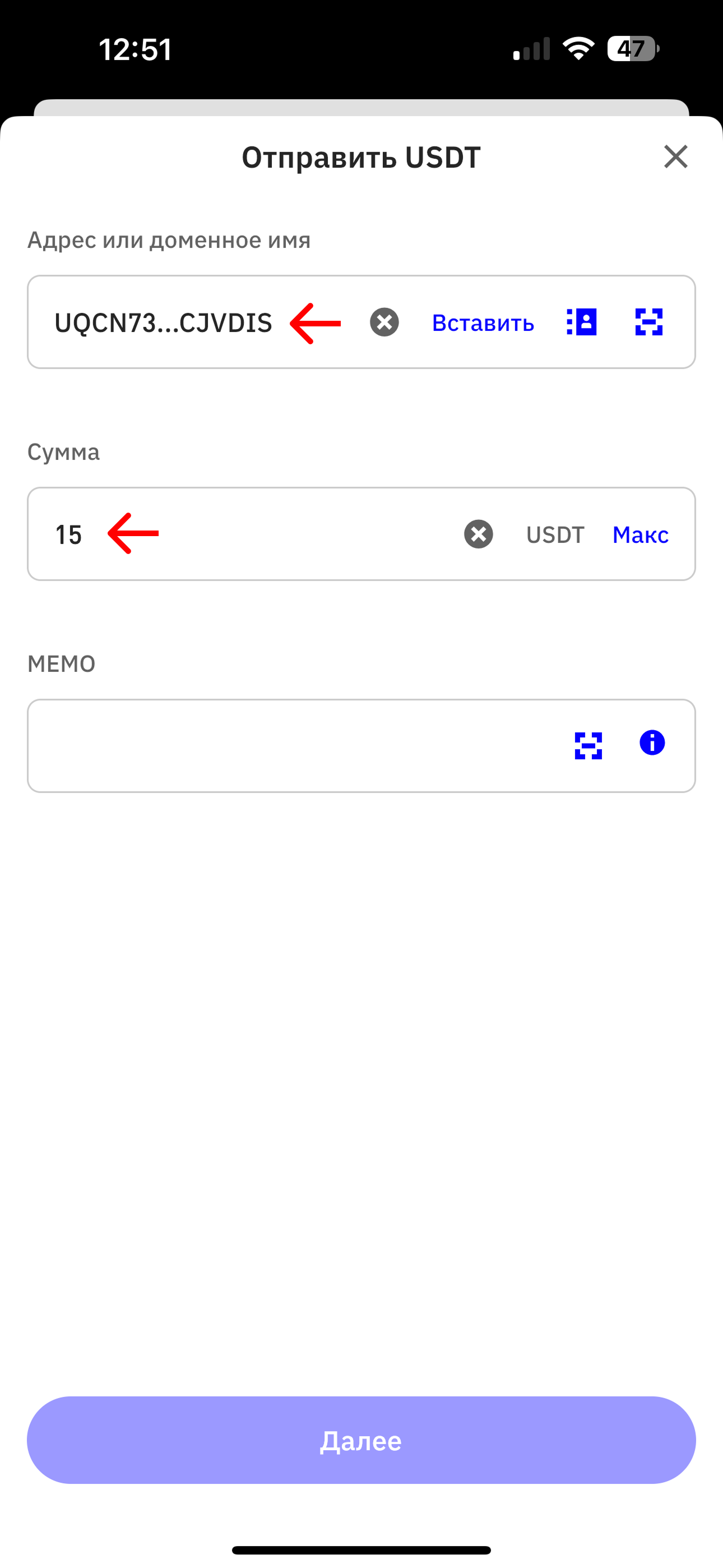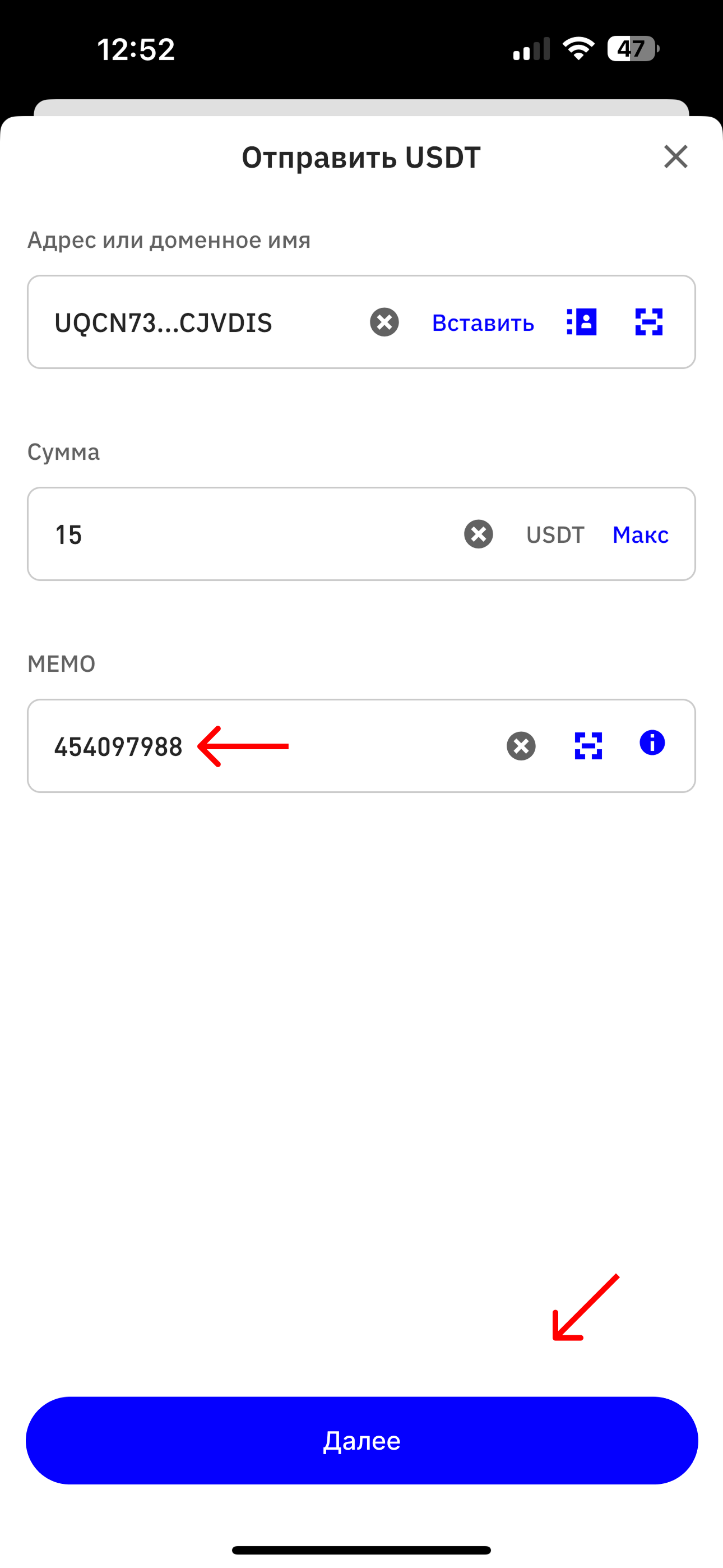 6. Откройте приложение TrustWallet и в поле *"MEMO"* вставьте скопированный MEMO из приложения HASH7. \