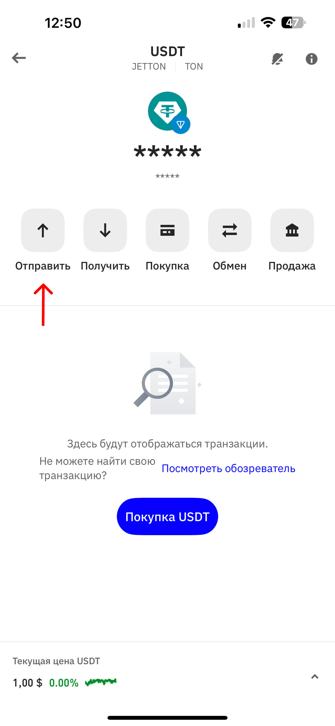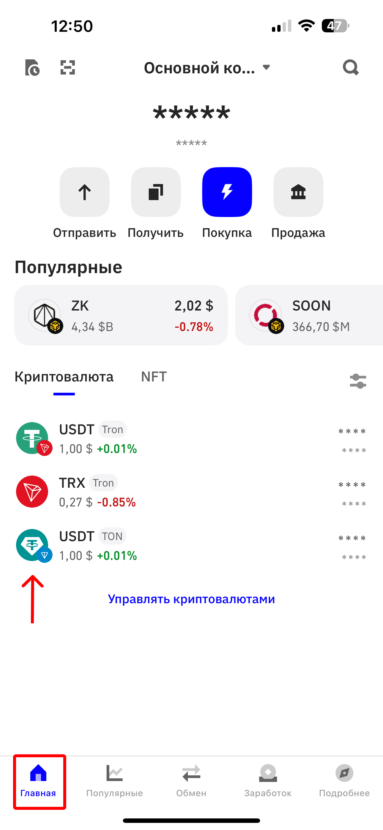 Если вы ранее не переводили средства через данную сеть, то добавьте ее нажав на "Управлять криптовалютами". Обратите внимание, чтобы иконка содержала логотипы USDT и TON.&#x20;