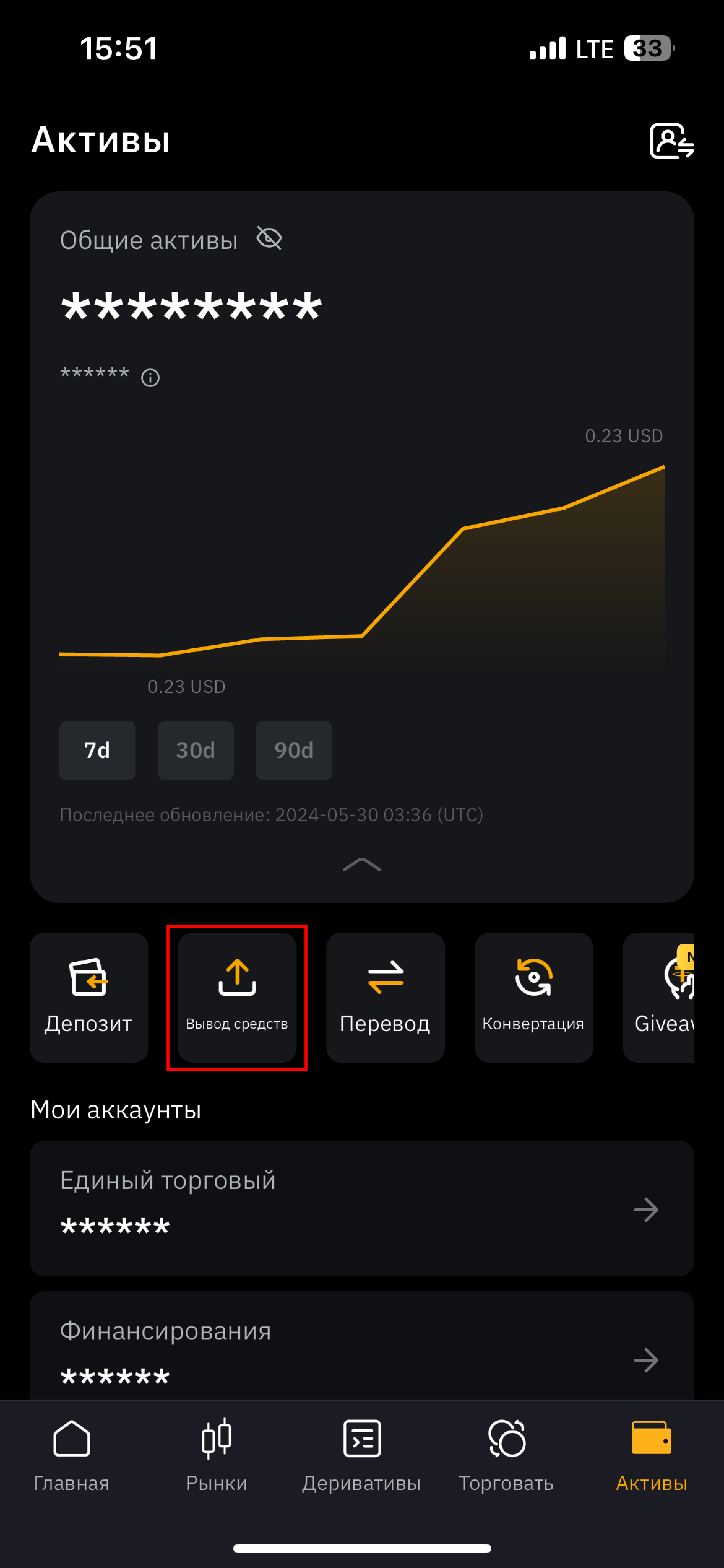 2. Откройте приложение биржи Bybit и перейдите в раздел **"Активы"**. В данном разделе нажмите на **"Вывод средств"**.