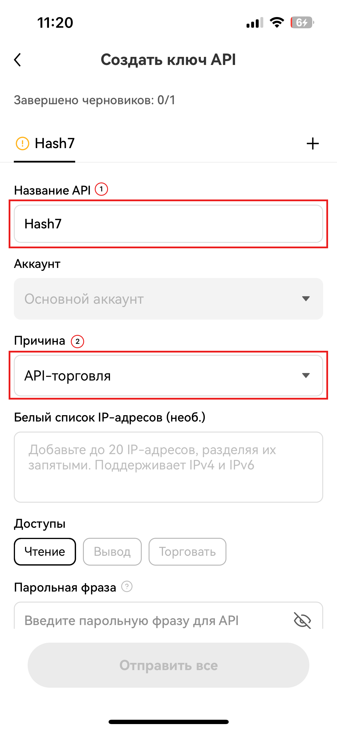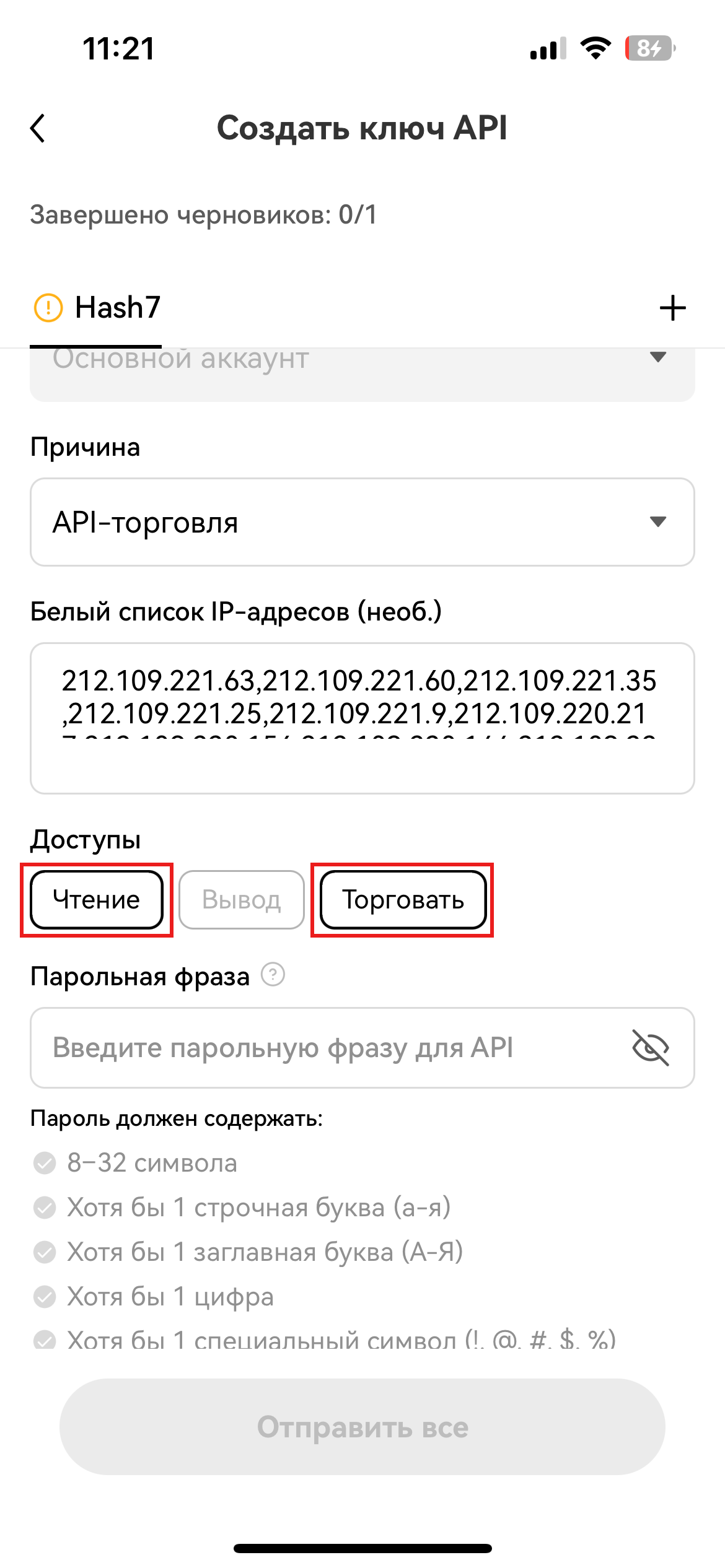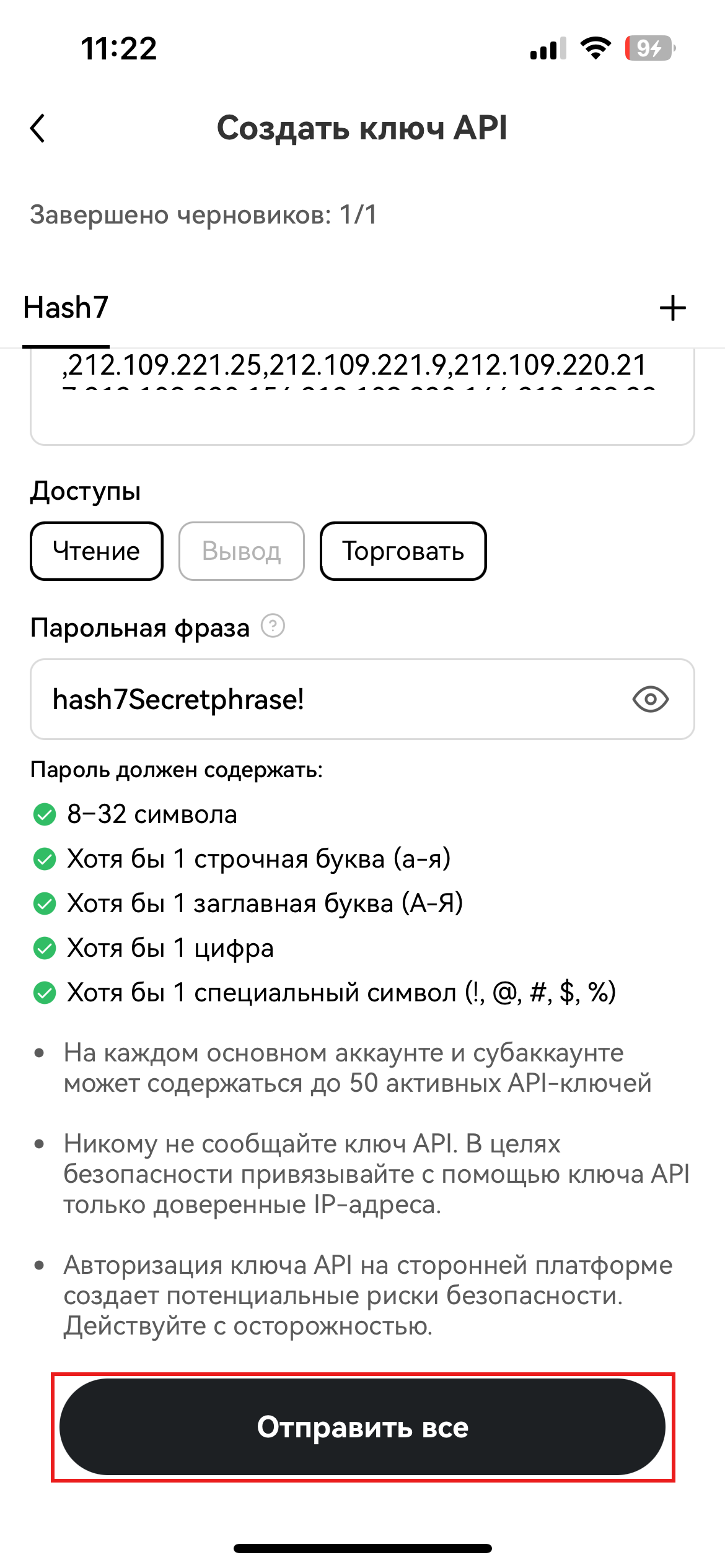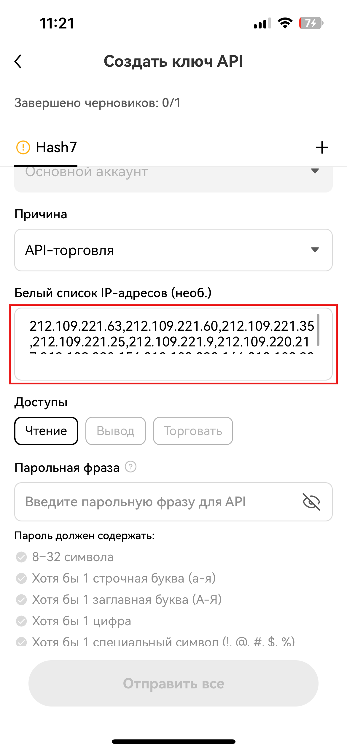 Вернитесь в официальное приложение OKX и в поле "Белый список IP-адресов" вставьте скопированные IP-адреса с приложения Hash7.&#x20;