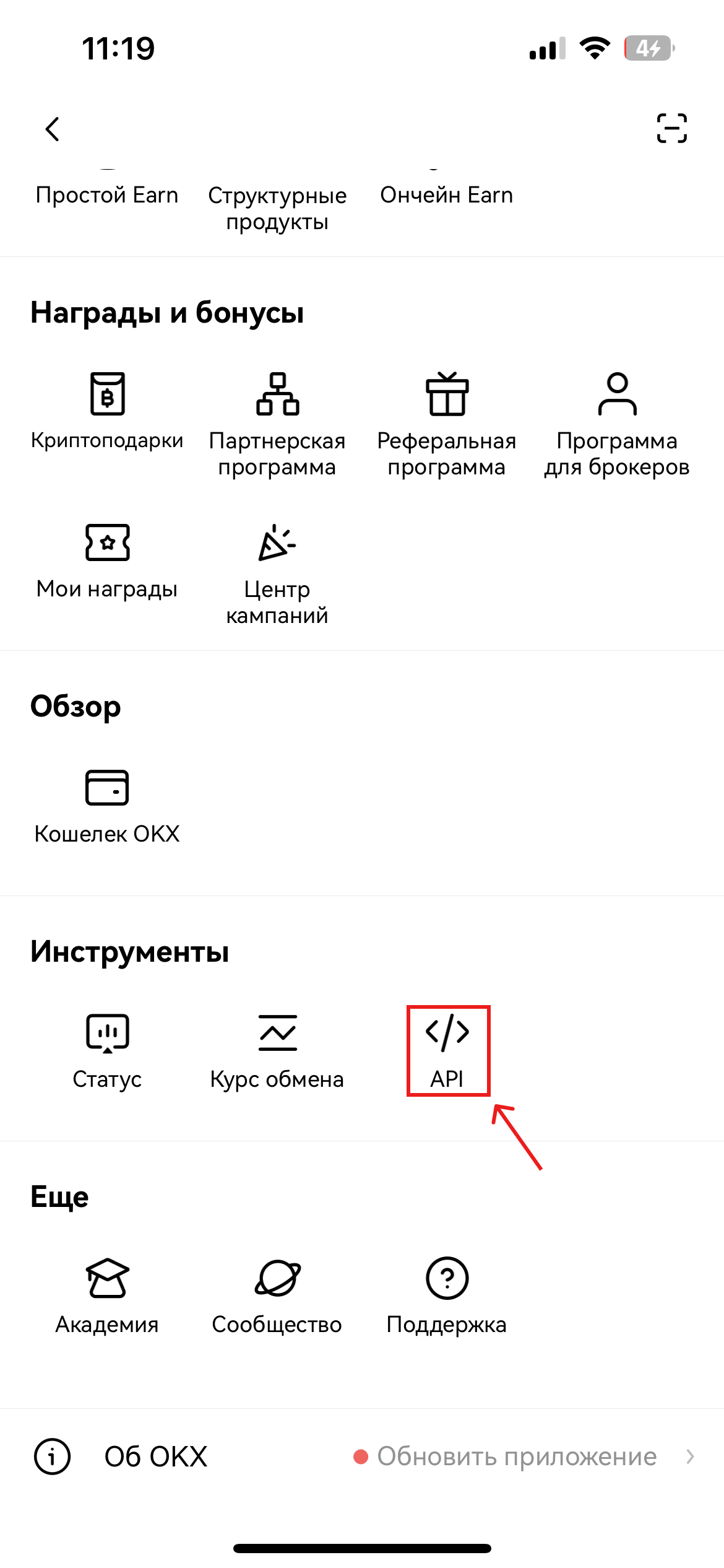 В появившемся меню, пролистав вниз, выберите пункт "API".