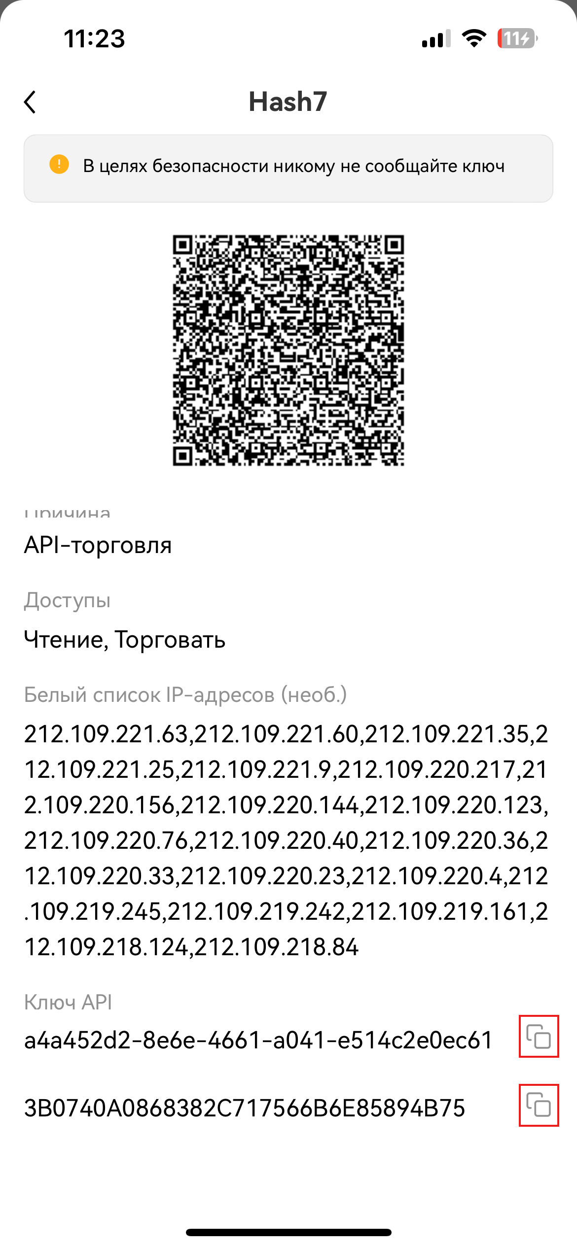 **В целях безопасности API-секрет будет отображен только 1 раз. После закрытия окна API-секрет будет недоступен, поэтому скопируйте ключ своевременно.**&#x20;