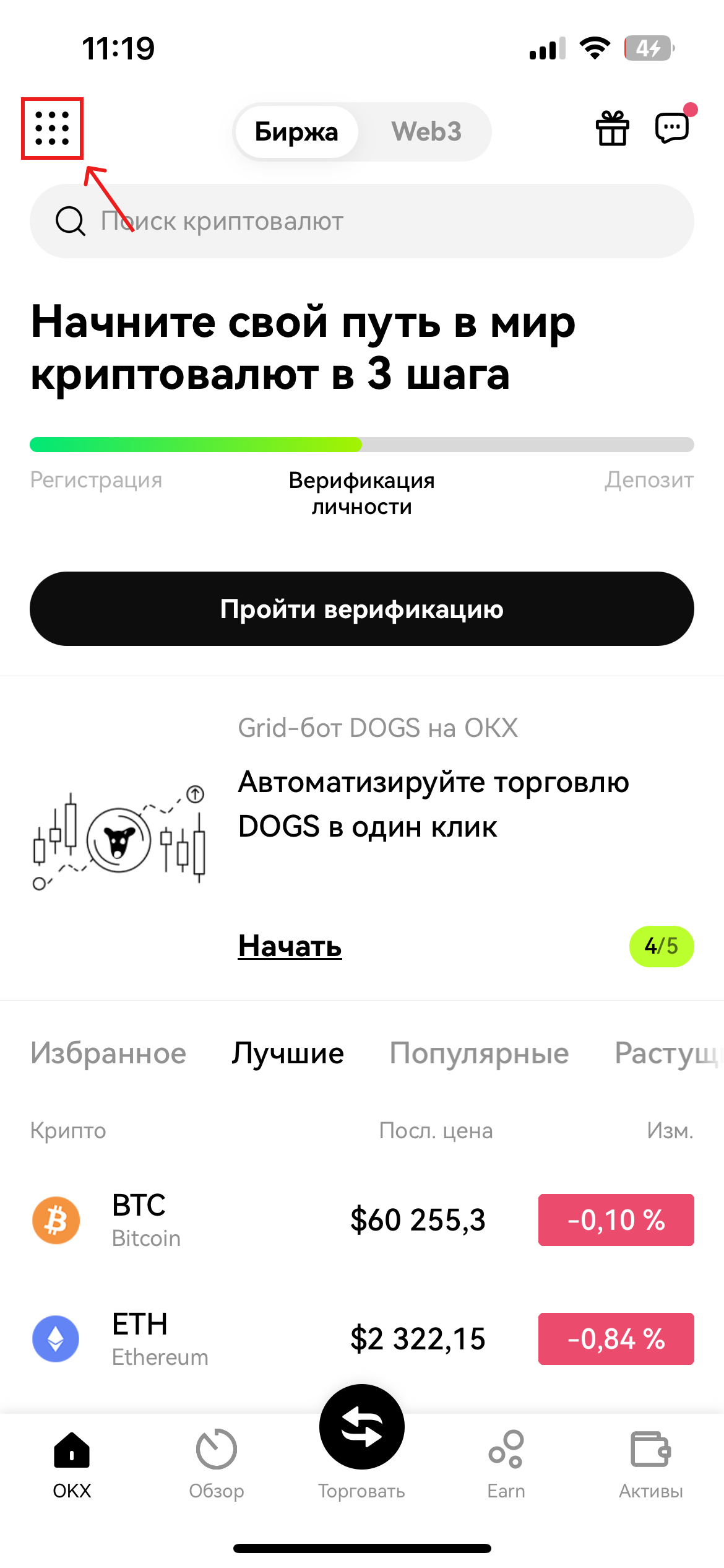 Откройте приложение OKX и нажмите на меню в левом верхнем углу.&#x20;