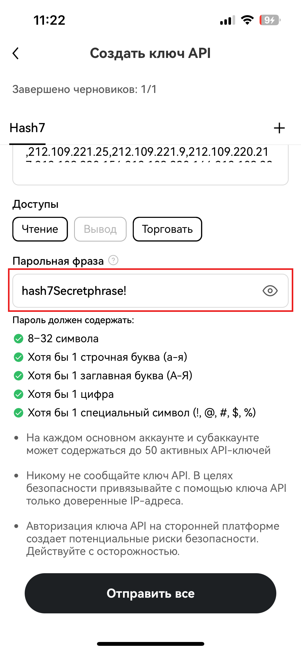 *Данный раздел необходим для просмотра информации и доступа к интерфейсу АРІ. Храните ее в безопасности и создайте новый API-ключ в случае утери фразы. Парольная фраза должна включать прописные и строчные буквы и состоять из 8-32 символов. Пробелы и специальные символы не поддерживаются.*