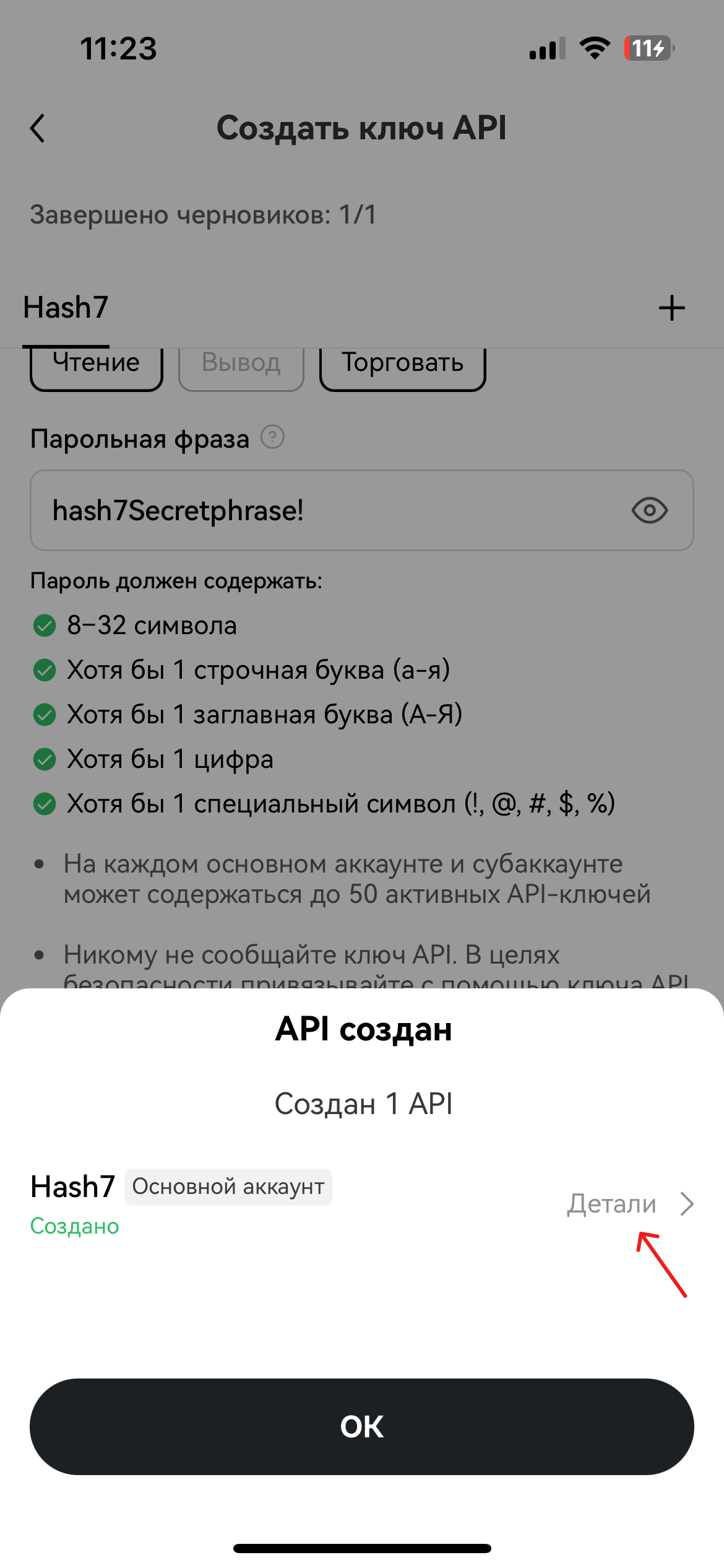 Ваши API-ключи успешно созданы! В появившемся окне нажмите на "Детали".&#x20;