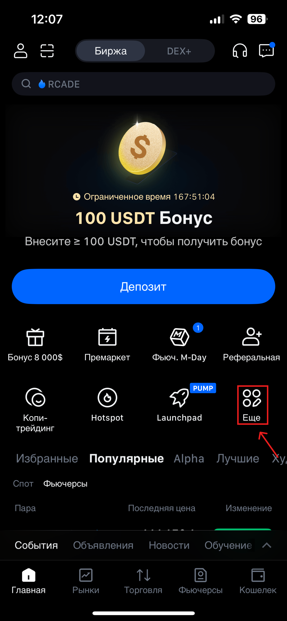 Откройте приложение MEXC и перейдите в раздел "Главная". В данном разделе нажмите на пункт "Еще".