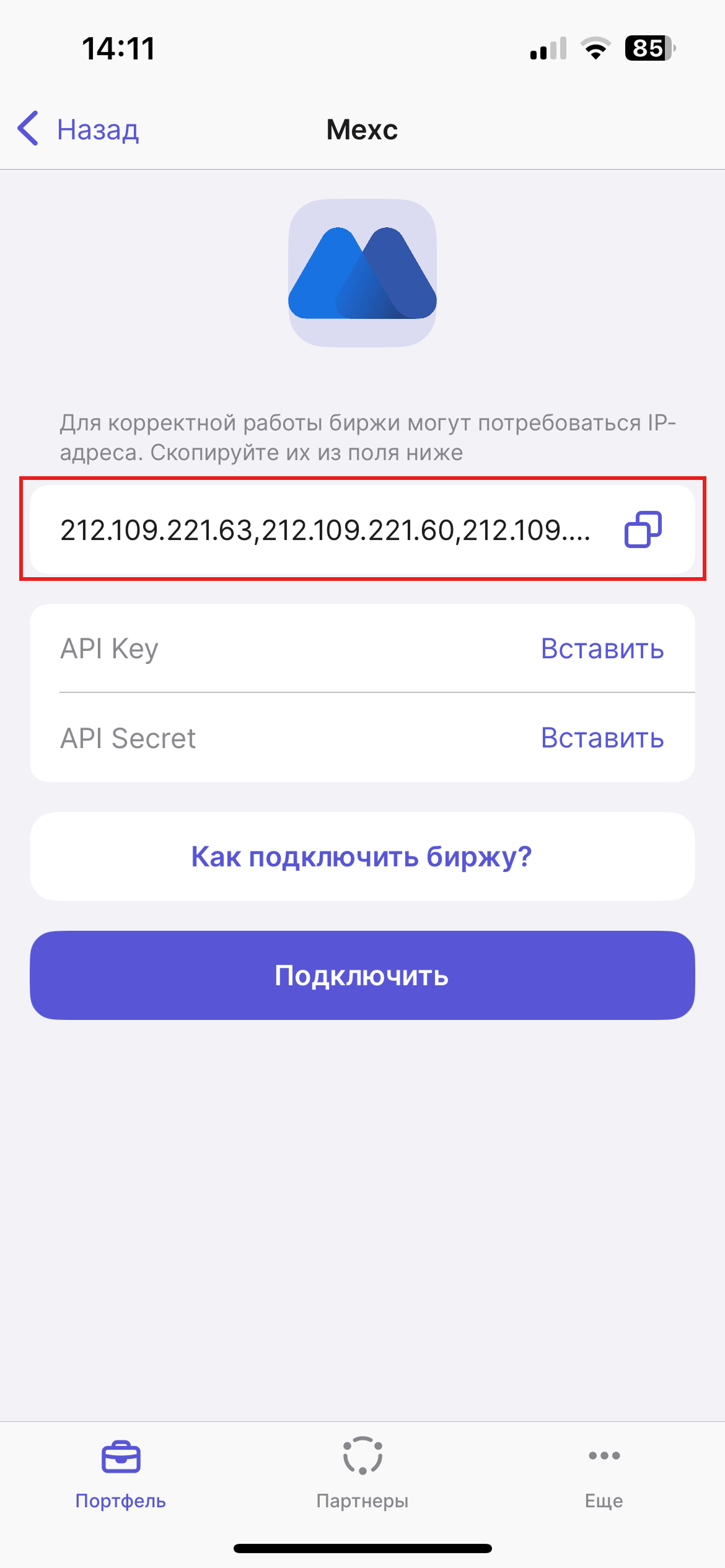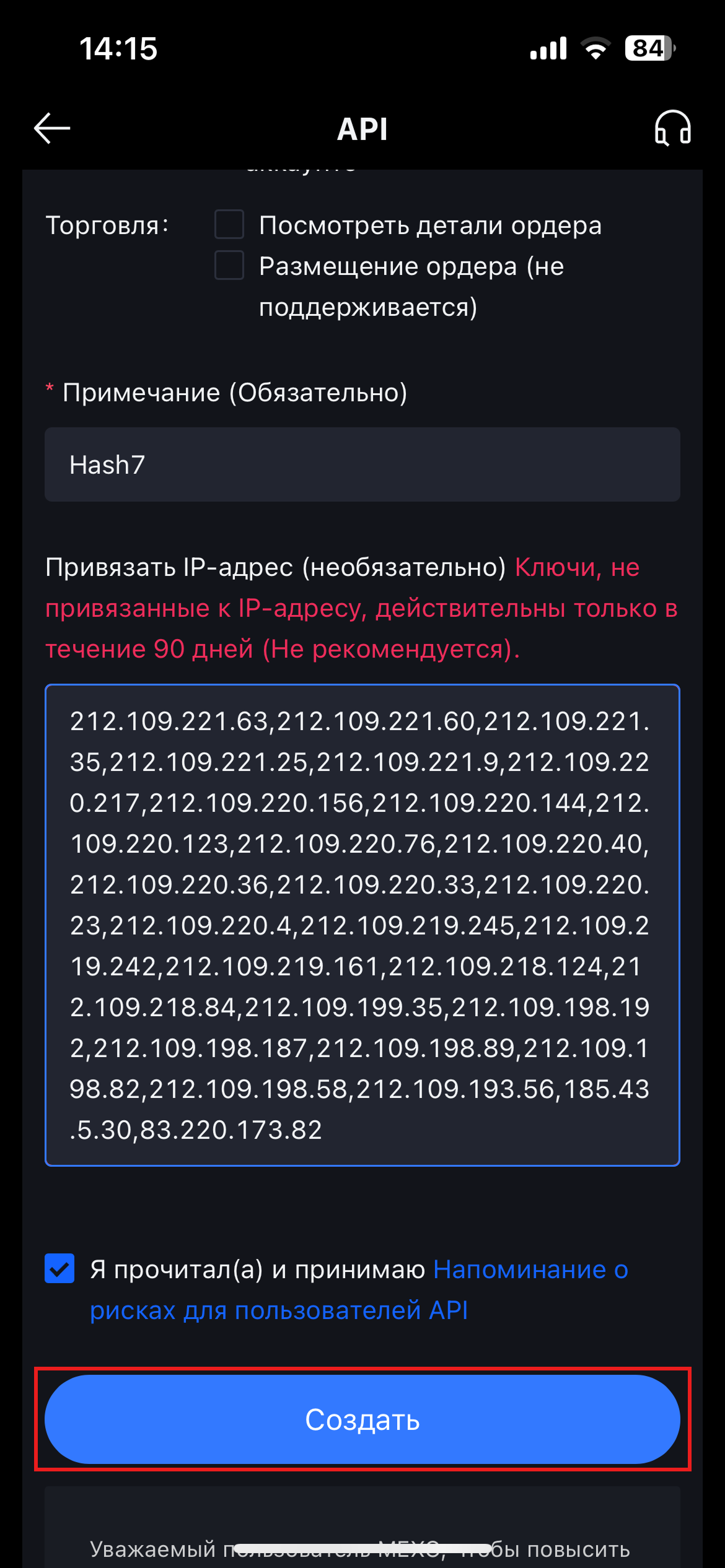 Вернитесь в официальное приложение MEXC и в поле "Привязать IP-адрес" вставьте скопированные IP-адреса с приложения HASH7.&#x20;