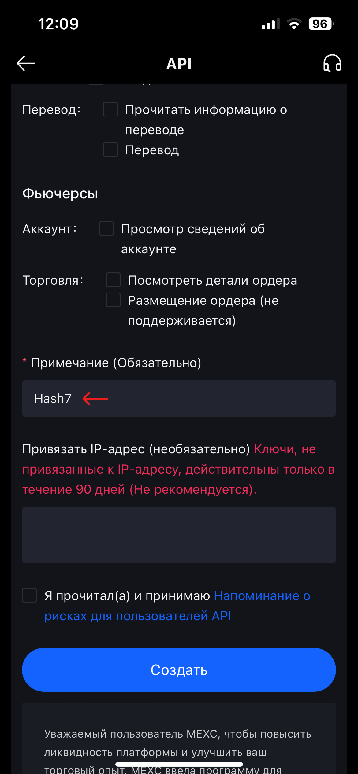 Ниже, поставьте галочку рядом с пунктом о том, что вы ознакомились с напоминанием о рисках для пользователей API. Для завершение процесса нажмите на "Создать" и пройдите проверку безопасности.&#x20;