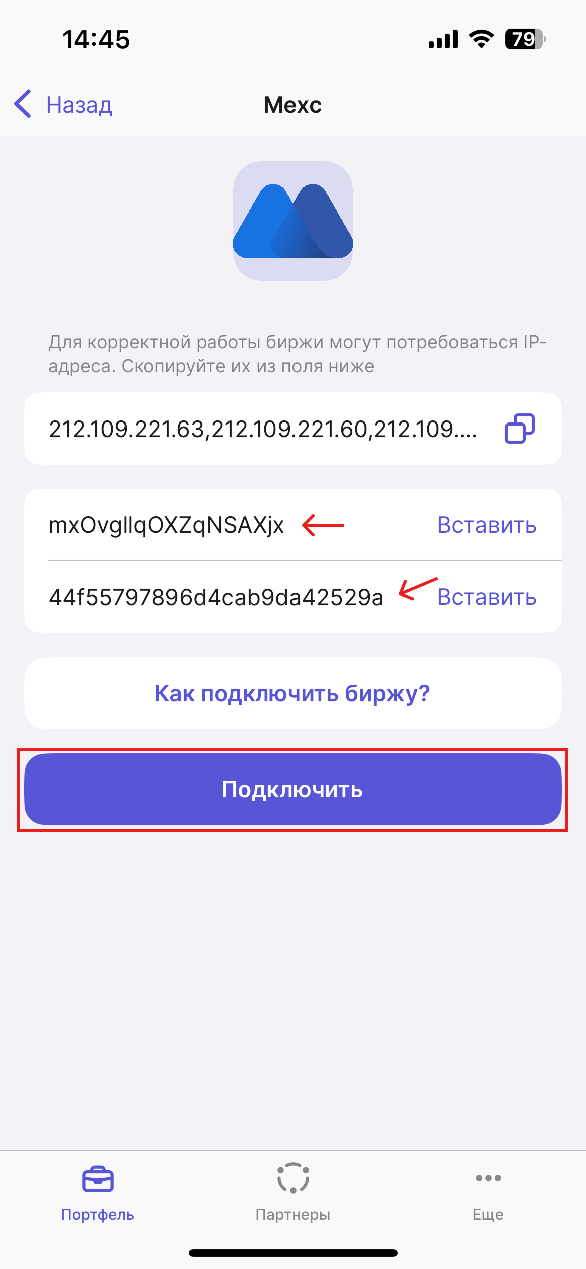 Затем повторно откройте приложение HASH7 и вставьте скопированные ключи в соответствующие поля. Для завершения процесса, нажмите на кнопку “Подключить”.