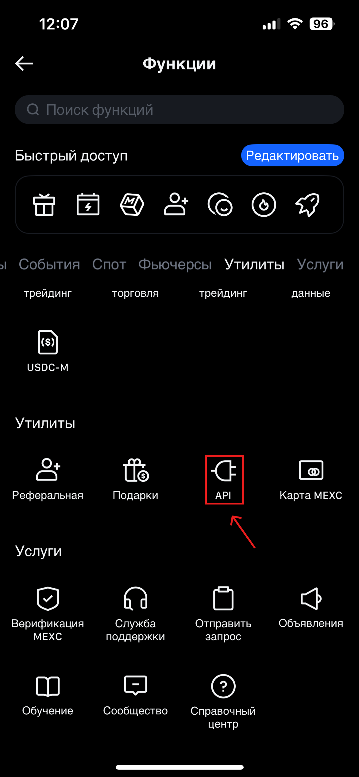 В меню выберите пункт "API".