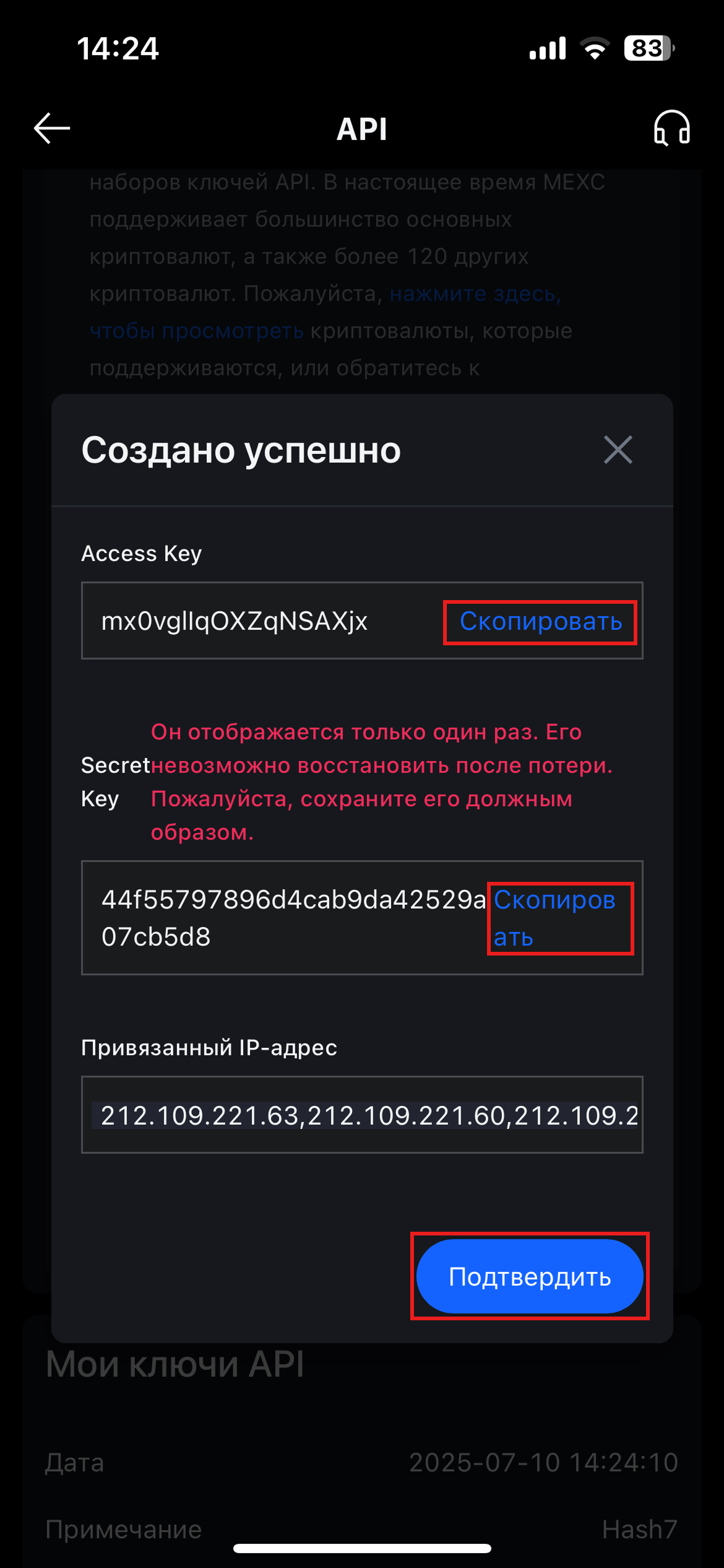 Далее скопируйте ваш API ключ (Access Key) и API Секрет (Secret Key) в надежное место и нажмите на "Подтвердить".&#x20;