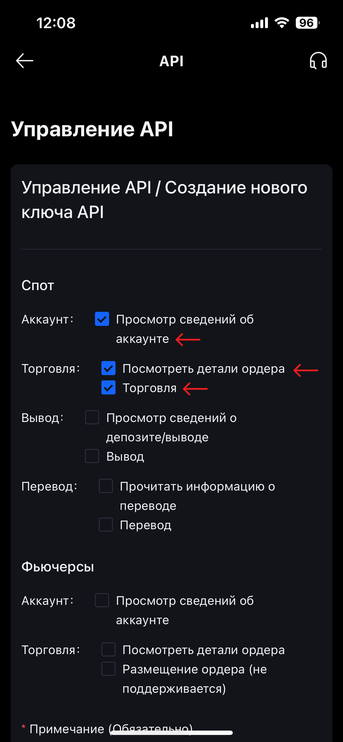 На странице "Управление API" в разделе Спот выберите следующие пункты:&#x20;