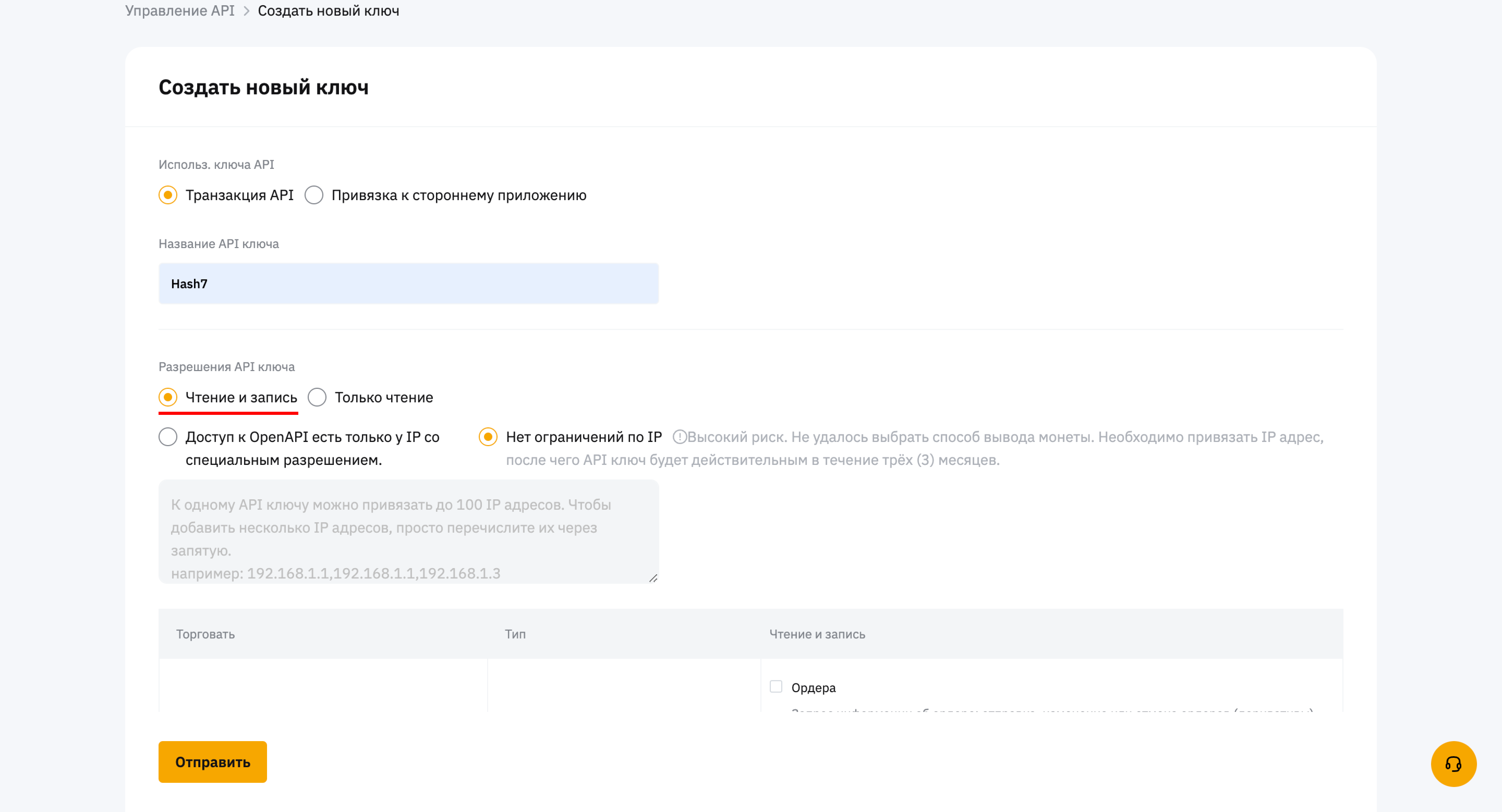 В разделе "Разрешения API ключа" выберите пункт "Чтение и запись".